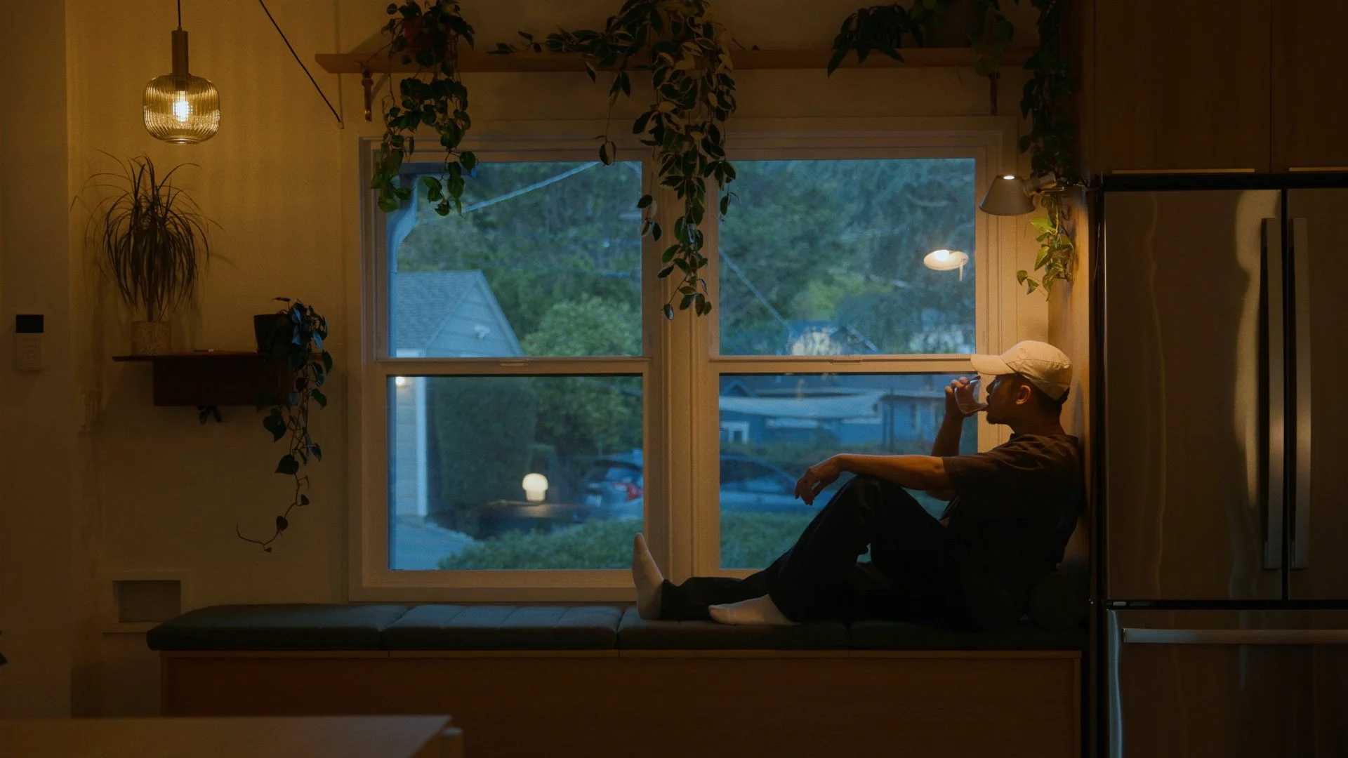 This corner gets great natural light in the morning, but we wanted it to feel warm and cozy at night. We found a reeded green glass pendant with brass fixtures. It has more vintage character than I normally choose, but in a 1940s home, it makes perfect sense.