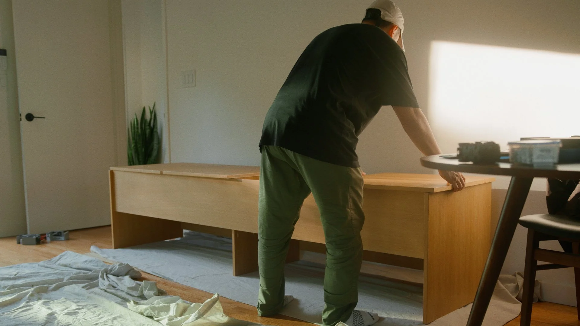 In the end, this entryway bench became more than a storage solution. It was a full design-and-build exercise: repurposing an old worktable into clean, functional cabinetry, solving real constraints (hello, robot vacuum clearance), and finishing the corner with thoughtful lighting and styling so it feels calm every time we walk in the door.