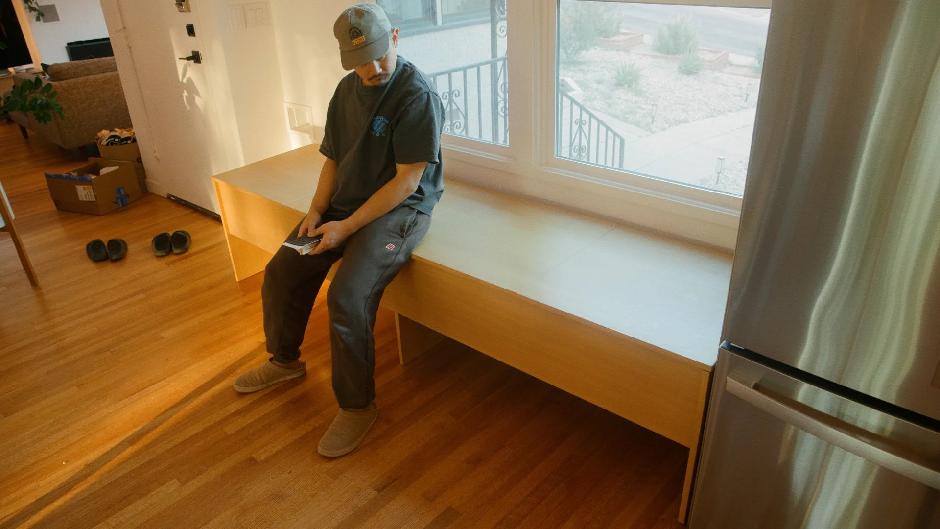 Once the bench was assembled, we realized something obvious: shoes were going to destroy the inside.
