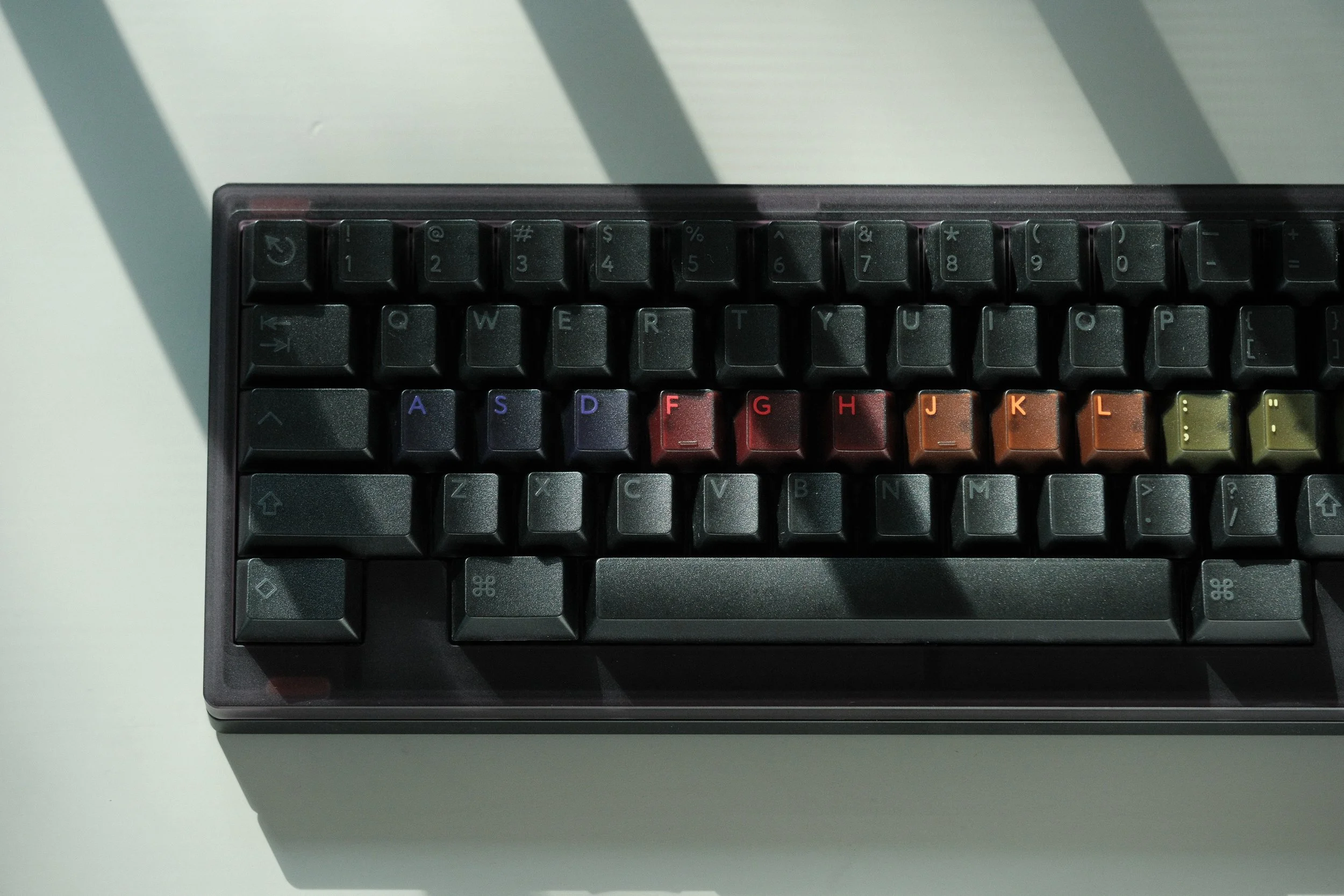 These keycaps are semi-transparent; therefore, colors are sensitive to lighting and viewing angle.
